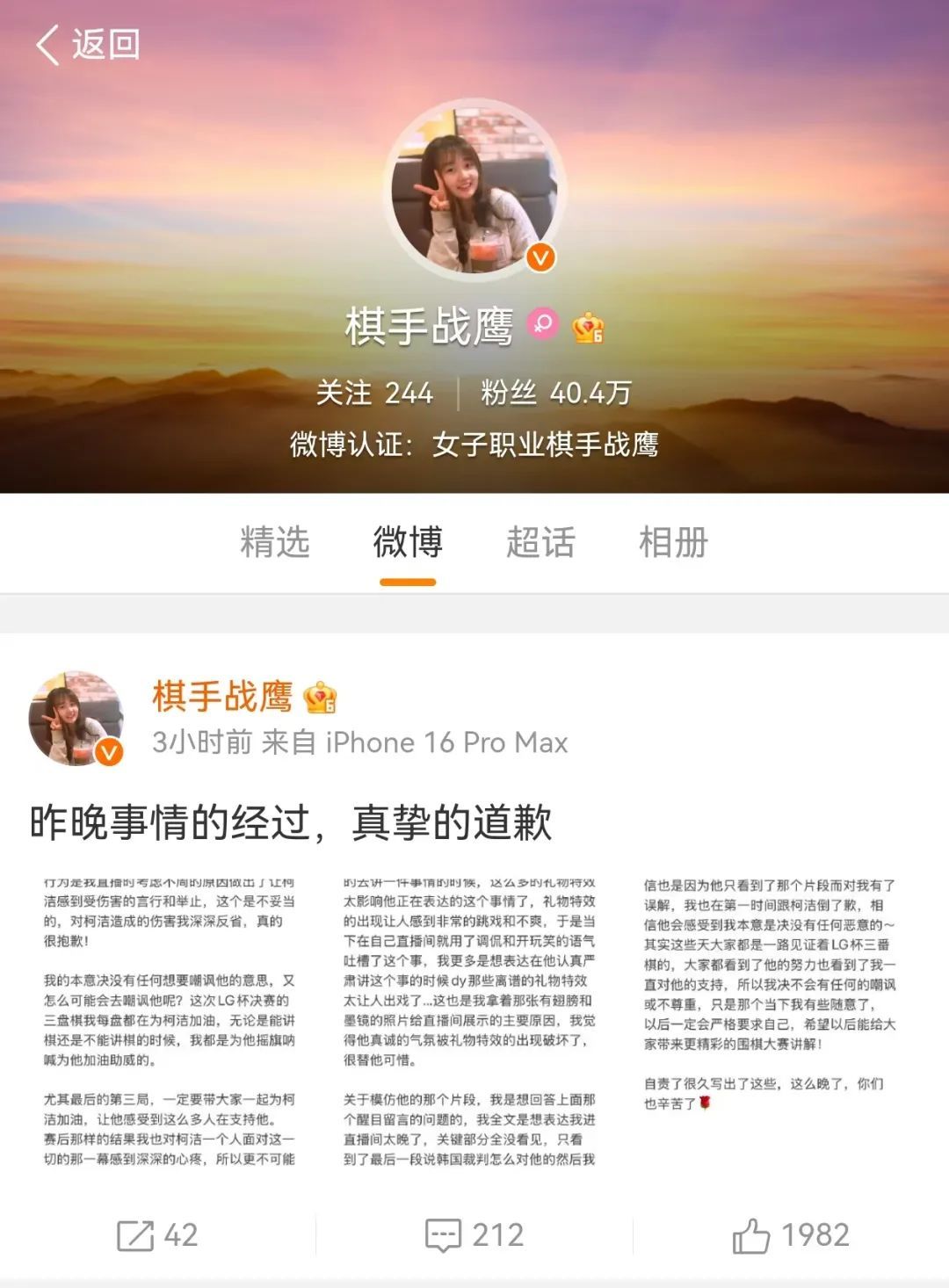1月27日股票能配资吗,#战鹰发文向柯洁道歉#冲上微博热搜,引发网友关注。 1月27日5时57分,棋手战鹰通过个人社交账号发文对柯洁道歉,表示自己在26日晚直播时考虑不周,做出了让柯洁感到受伤害的言行和举止,这是不妥当的。自己对柯洁造成的伤害深深反省,真的很抱歉! 战鹰在回应文章中提到,对于她在直播中“边回答网友留言边模仿柯洁”这一行为,对柯洁表示诚挚的道歉,对不起。 战鹰表示,“这个行为是我直播时考虑不周的原因,做出了让柯洁感到受伤害的言行和举止,这是不妥当的。对柯洁造成的伤害我深深反省,真的很抱歉!我的本意决没有任何想要嘲讽他的意思,又怎么可能会去嘲讽他呢?” 战鹰称,自己是想表达进柯洁直播间太晚了,关键部分全没看见。“只看到了最后一段说韩国裁判怎么对他的,然后我正在悲伤,他突然说要打游戏了,加上dy的各种抽象特效,让我一下子有种看电视剧我还在为主角痛哭突然换了下一集的感觉。于是有了那些模仿的动作,并想表达:我什么有用的信息都没看到,我得下播了去补切片!但那时模仿动作和语气让柯洁觉得不适了,就是我的问题,我再次道歉,真的很抱歉。” 公开资料显示,战鹰,1995年4月8日出生于河北保定,中国职业围棋选手、围棋赛事解说员、哔哩哔哩知名UP主。 此前报道: 1月26日,柯洁开直播向网友们汇报现状:我还活着。 来源 | 红星新闻综合九派新闻、@棋手战鹰 |